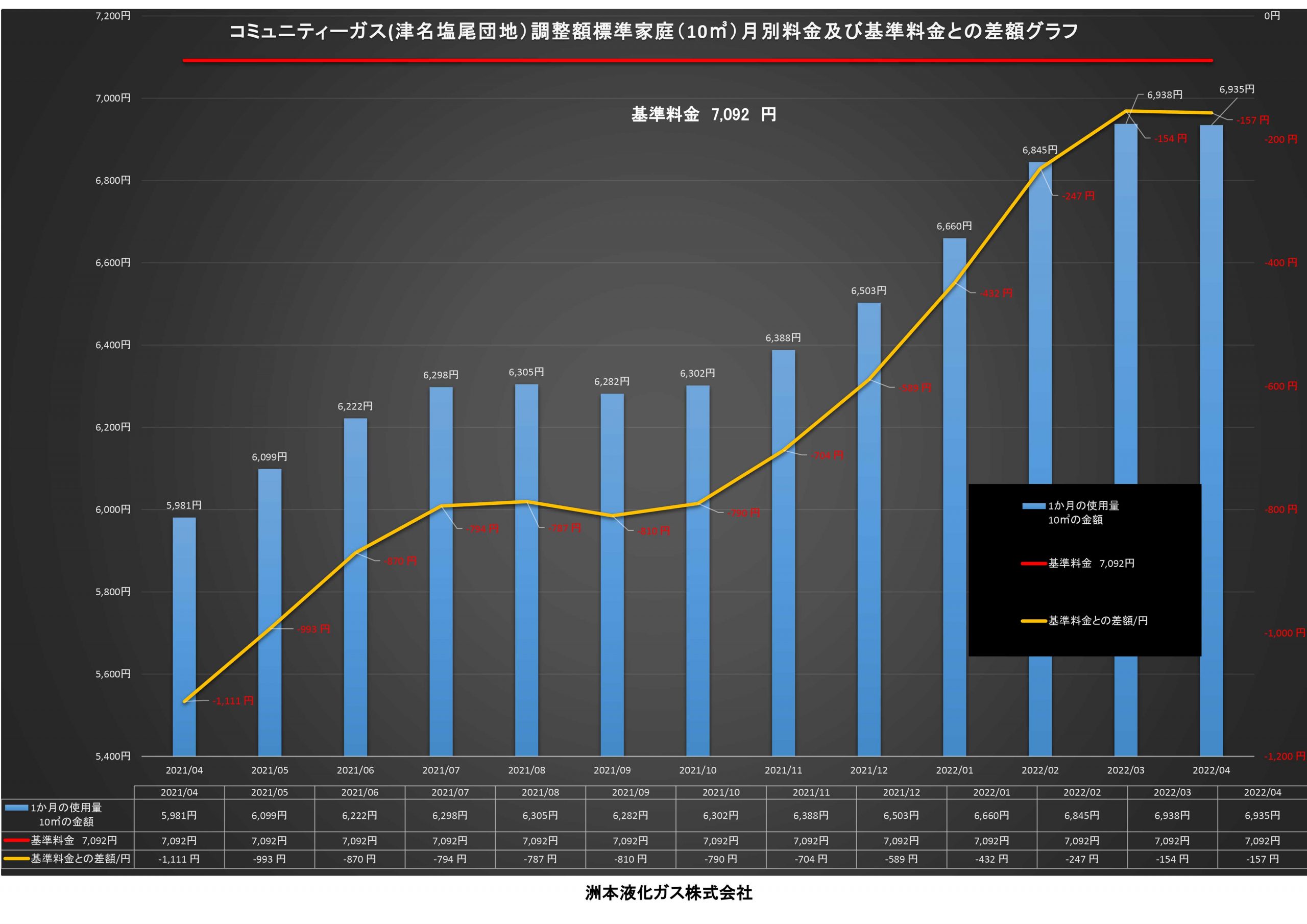 下記の表は、過去1年間の月別料金及び基準料金との差額をグラフにしたものです。