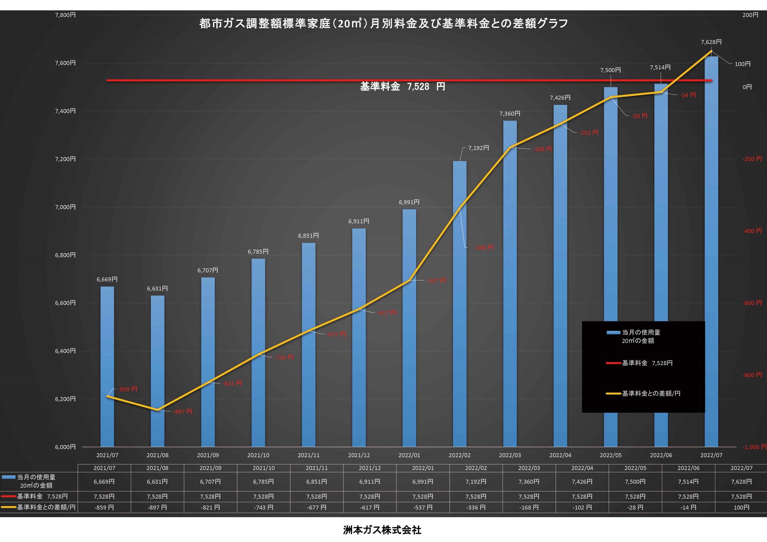 下記の表は、過去1年間の月別料金及び基準料金との差額をグラフにしたものです。