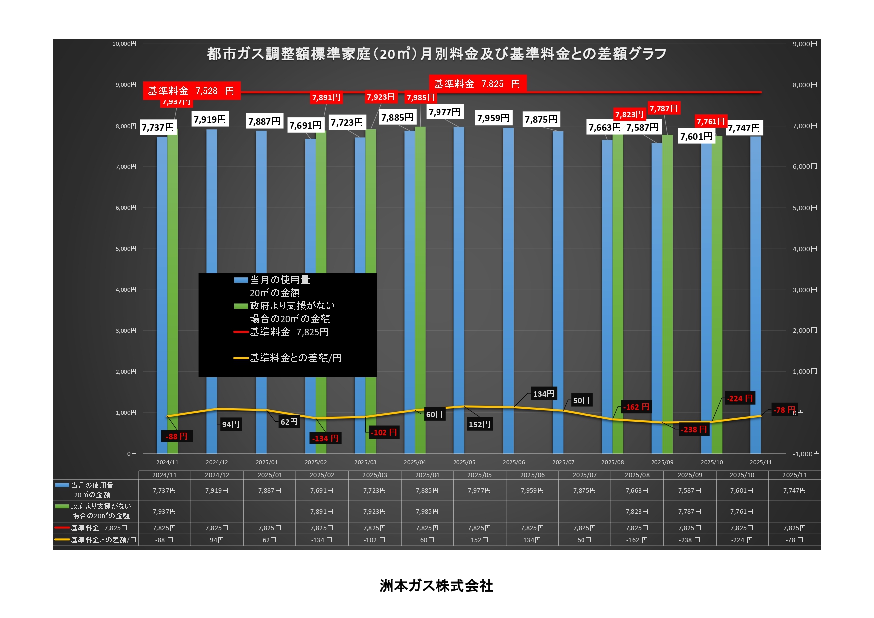 調整額標準家庭月別料金及び差額(都市ガス)2025_11