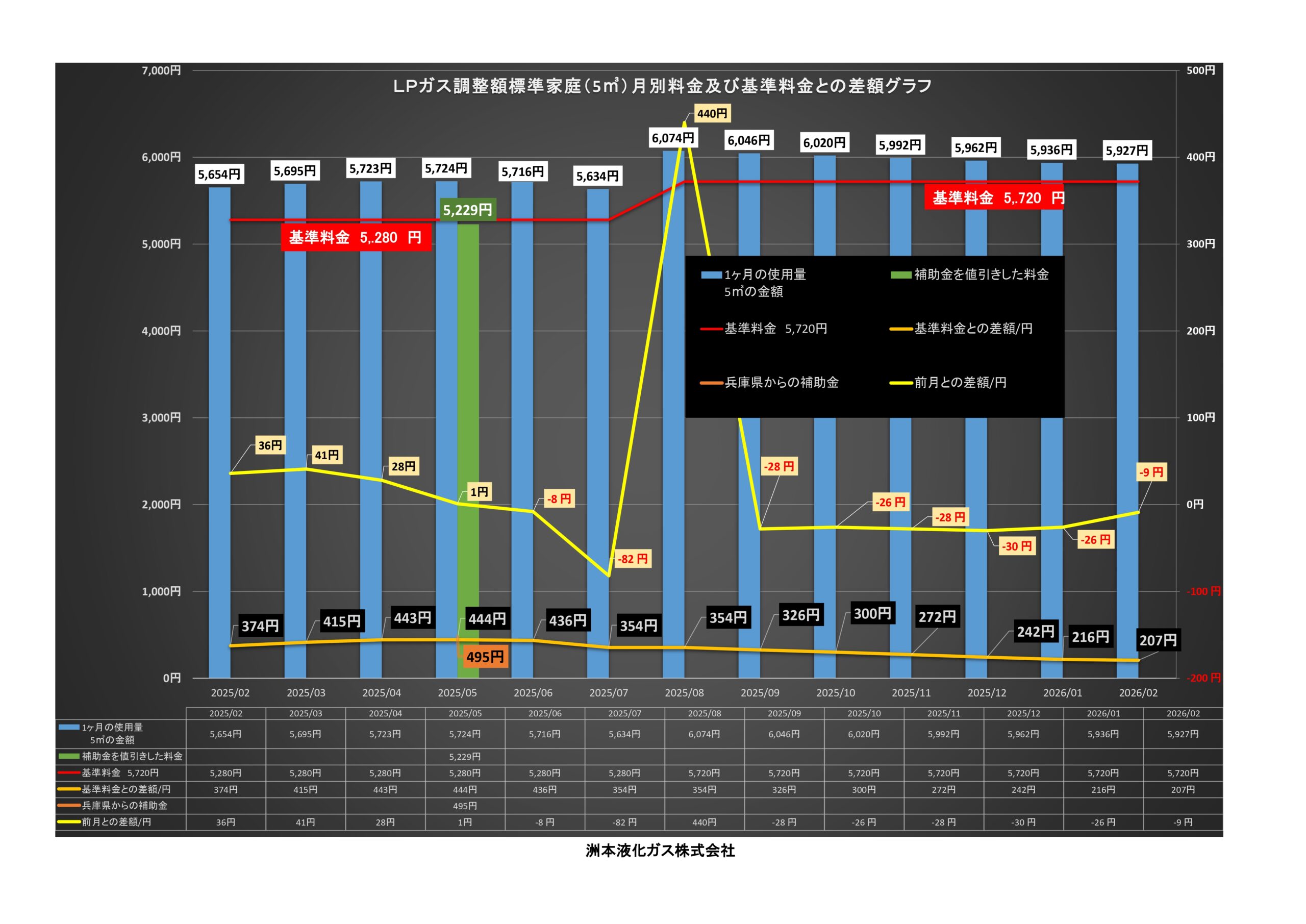 下記の表は、過去1年間の月別料金及び基準料金との差額をグラフにしたものです。